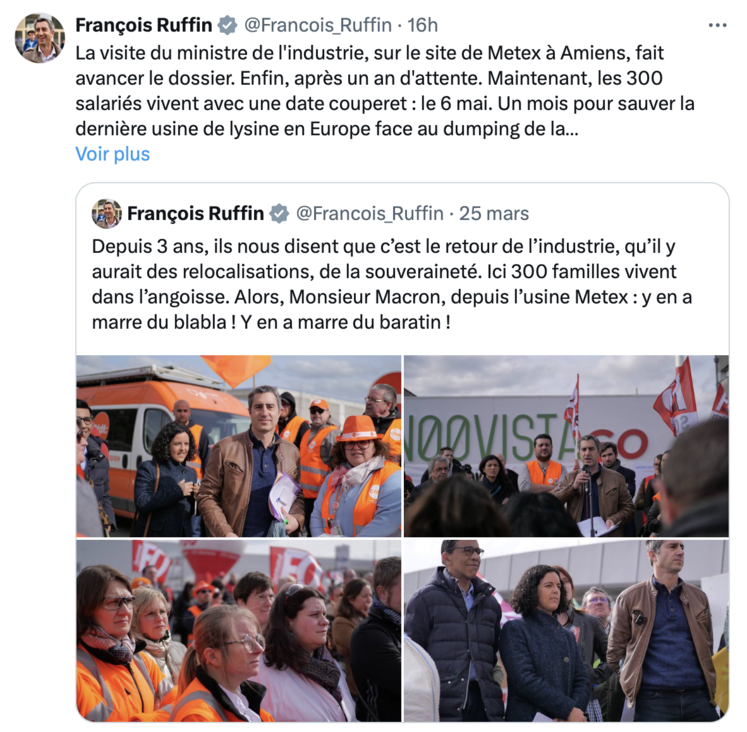 Pour le second, le déplacement de Roland Lescure à Amiens a aussi eu du bon, comme il l’a exprimé sur X (ex-Twitter) : « La visite du ministre de l'industrie, sur le site de Metex à Amiens, fait avancer le dossier. Enfin, après un an d'attente ». Implantée sur 40 hectares, Metex est spécialisée dans la fabrication d’acides aminés par fermentation pour l’alimentation animale et l’industrie cosmétique et pharmaceutique. Elle emploie 300 personnes, dont une partie sont depuis le début de l’année en chômage partiel.