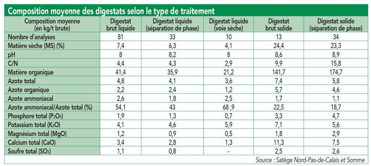 Les digestats produits par les sites de la Somme proviennent tous d’unités en «voie liquide infiniment mélangé». En sortie digesteur, ils sont donc bruts liquides (taux MS < 10 %). Afin de diminuer les volumes, certains sites poursuivent leur traitement par une séparation de phase ; ce qui donne alors une fraction liquide et une fraction solide. L’intérêt agronomique des digestats diffère selon la nature des intrants traités et du process de l’unité de méthanisation. Le tableau précise la composition moyenne obtenue sur les installations en fonctionnement du Nord-Pas-de-Calais et de la Somme selon le type de traitement. Ces valeurs sont indicatives car elles peuvent varier selon la nature des intrants traités.