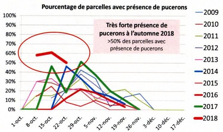 L’automne 2018 en est d’ailleurs la preuve. «Cet automne est, jusqu’à présent, d’une extrême douceur, ce qui favorise la présence des ravageurs comme les pucerons, mais aussi les cicadelles, Psammotrex alienus», explique Elodie Gagliardi, ingénieur régional chez Arvalis. Au 15 octobre 2018, par exemple, l’observation de pucerons a été constatée dans plus de 60 % des parcelles suivies, contre 45 % des parcelles en 2017 et 0 en 2016. Or, n’oublions pas que ces derniers peuvent apporter la jaunisse nanisante de l’orge, JNO, pour les céréales. Une maladie non sans conséquence, car cette dernière entraîne systématiquement une perte de rendement, pouvant aller jusqu’à moins 40 qx/ha.