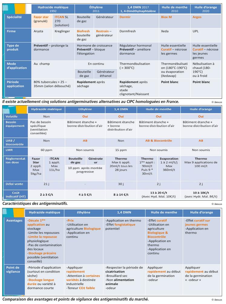 La stratégie pour contrôler la germination des pommes de terre en stockage devra préférentiellement reposer sur une combinaison des cinq matières actives actuellement homologuées comme produits antigerminatifs (hydrazide maléique, huile de menthe, éthylène, 1,4 diméthylnaphtalène, DMN, et huile d’orange par ordre chronologique d’homologation), et non pas reposer sur l’emploi exclusif de l’une ou l’autre.