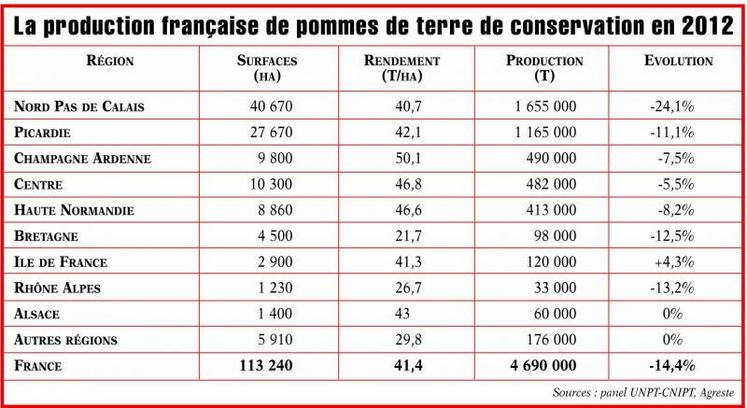 La production française de pommes de terre de conservation est estimée par l’Union nationale des producteurs de pommes de terre (Unpt), pour la campagne en cours, à 4,69 Mt soit une chute de 14,6 %, c'est-à-dire moins de 800 000 t par rapport à celle, certes abondante, de l’an dernier. Elle se retrouve aussi en baisse de quelque 10 % sur la dernière moyenne quinquennale. En outre, au mois de décembre 60 000 à 100 000 t restaient encore à récolter dans la frange maritime la plus septentrionale de l’hexagone et compte tenu de l’état des terrains détrempés, elles ne pourront sans doute pas être arrachées, aggravant encore le bilan négatif annoncé. Toutes les grandes régions de production sont concernées par cette baisse exceptionnelle de production (voir tableau ci-contre).