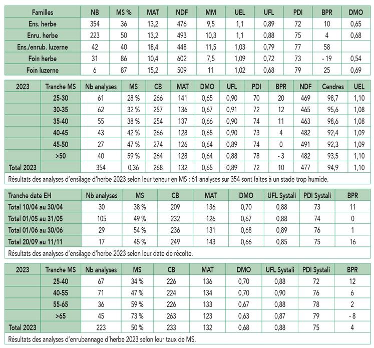Les résultats des analyses montrent une grande hétérogénéité des valeurs alimentaires. Que ce soit pour des vaches en production, des génisses, des vaches taries... toutes les coupes d’herbe sont intéressantes à condition qu’elles soient bien conservées et adaptées aux animaux qui les consomment. Grâce à une très bonne pousse de l’herbe, l’année 2023 a souvent été l’occasion de reconstituer des stocks fourragers qui étaient déficitaires.