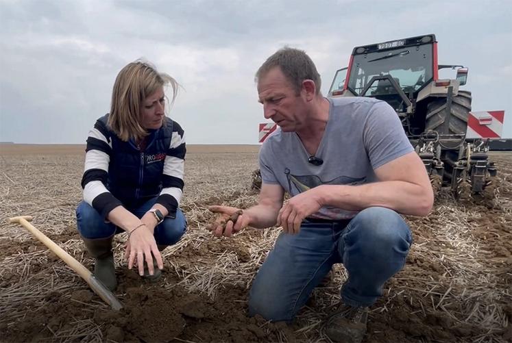 Tour de plaine au printemps dernier dans le cadre du GIEE Sols Vivants Plateau Picard avec son animatrice, Mathilde Lheureux, conseillère Chambre d’agriculture de la Somme chez Bernard Mercier, agriculteur à Candas, sur une parcelle conduite en ACS depuis trois ans : «J’effectue seulement deux passages avant implantation de betteraves en strip till. Un premier à l’automne, ici en sol argileux, je place la grosse dent à 22 cm de profondeur pour bien travailler la structure en profondeur et dégager la paille de la ligne de semis. Je prévois un second passage au printemps sur le même rang avec un disque gaufré ou la dent en fonction des conditions météo.»