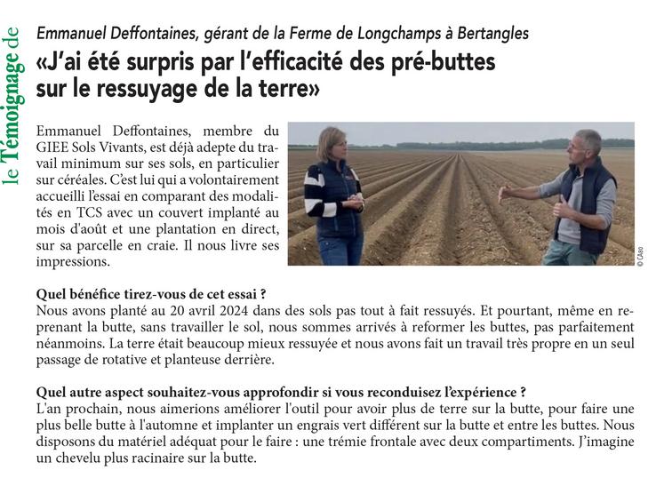 Un essai a été mené à l’automne 2023 par le GIEE Sols Vivants du Plateau Picard, animé par Mathilde Lheureux, conseillère à la Chambre d’agriculture de la Somme qui étudie la faisabilité d’implanter des pommes de terre avec des pré-buttes d’automne en parcelle de craie.