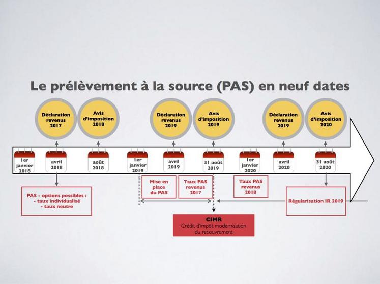 Le prélèvement à la source (PAS) implique pour le contribuable une sortie de trésorerie mensuelle, voir trimestrielle. En l’absence d’un mécanisme de correction, le contribuable aurait dû, outre s’acquitter du PAS, payer en 2019 l’impôt sur les revenus de l’année 2018. Une telle situation aurait généré une double sortie de trésorerie. Afin de l’éviter, le législateur a instauré un dispositif, «au nom barbare» : le Crédit d’impôt modernisation du recouvrement (CMIR), qui aura vocation à gérer l’année de transition.