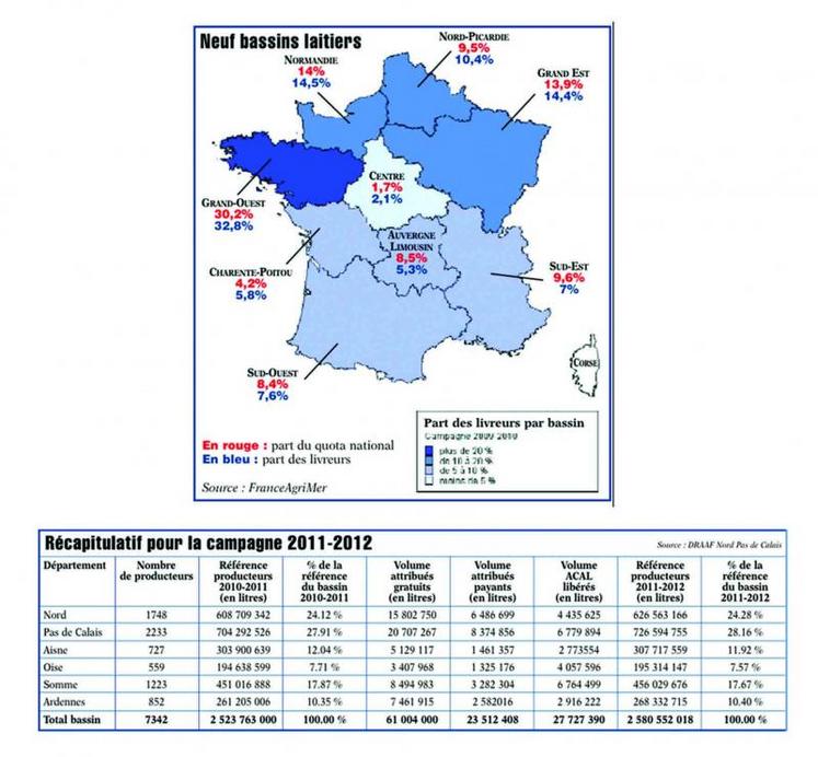 Sur 7342 producteurs laitiers présents sur le bassin 4676 ont déposé une demande au titre de la campagne 2011-2012, soit 63,69 % des producteurs laitiers. Des disparités du taux de retour sont constatées entre les départements : dans l’Oise, le taux est de 51,88 % alors que dans le Pas de Calais il est de 68,79 %. Plusieurs hypothèses peuvent expliquer ces différences, telles que la diffusion de l’information aux producteurs ou tout simplement des producteurs historiquement écartés des attributions à titre gratuit, qui n’ont pas intégré le fait que les règles de bassin les rendaient éligibles.