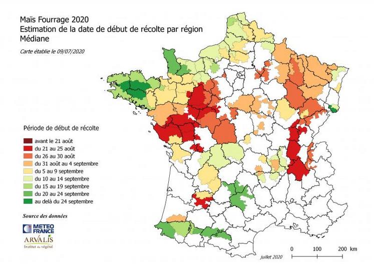 Pour chaque «région», les experts d'Arvalis ont défini le groupe de précocité dominant et la date médiane des semis en 2020. Avec les données météo de l'année en cours et les données météo fréquentielles des semaines à venir, il est possible de prévoir la période à laquelle le stade optimal de récolte sera atteint. Cette prévision est régulièrement mise à jour pour prendre en compte le climat de l'année.