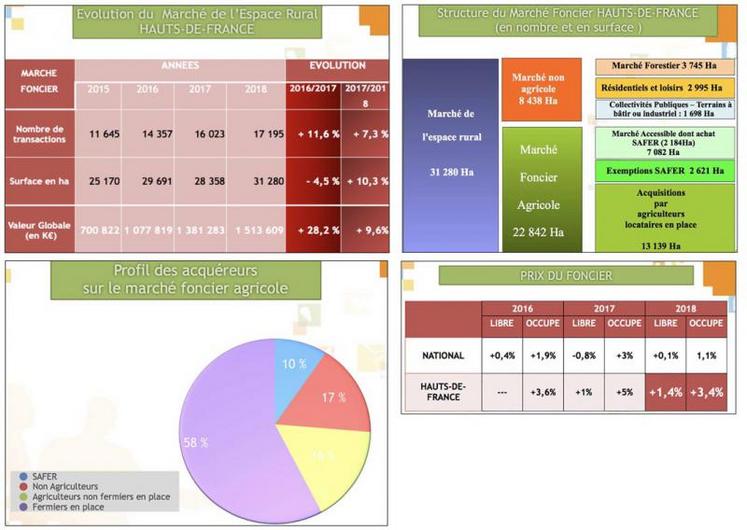 Si la Safer Hauts-de-France enregistre une augmentation des surfaces vendues en 2018 de 10 %, soit 31 280 ha contre 28 358 ha en 2017, le marché des terres agricoles reste un marché fermé. Sur ces 31 280 ha, le marché non agricole en comprend 8 438 ha et le marché foncier agricole 22 842 ha (soit 73 % de la destination totale des terres).