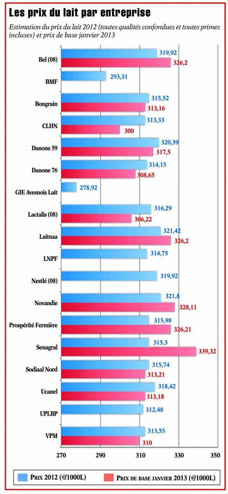 En 2012, le prix moyen du lait payé aux producteurs (voir graphique) s’élève à 313,4 €/1000L (toutes qualités confondues et toutes primes incluses). Toutefois, des disparités sont à noter : des écarts de presque 30 euros les 1000L peuvent s’observer entre deux laiteries à un mois donné. De même, les prix moyens annuels se répartissent entre 279 € et 320 €/1000L. Ce phénomène va de plus en plus s’observer.