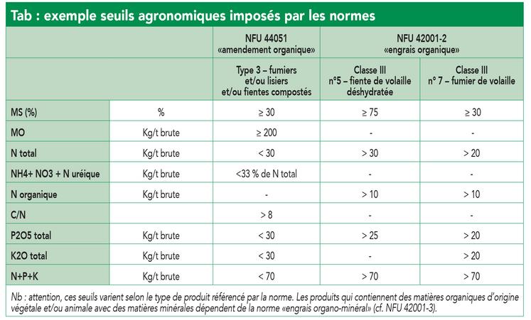 Les produits importés répondent généralement à la norme NFU 44-051 (amendement organique) ou à la norme NFU 42-001 (engrais). Attention, cette norme est désormais scindée en deux pour les produits organiques : NFU 42-001-2 (engrais organique) ou NFU 42-001-3 (engrais organo-minéraux).