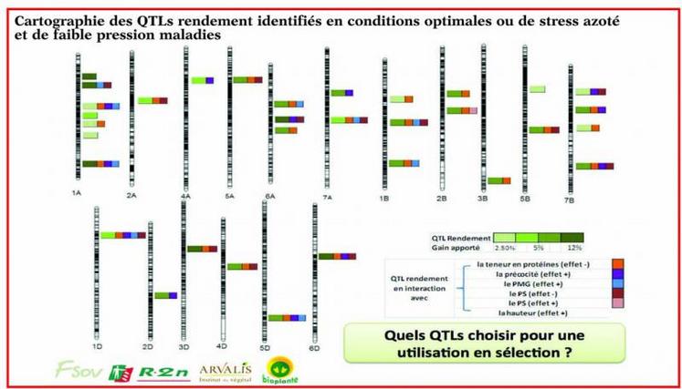 Les variétés de demain dépendront des recherches en cours sur le génome. Le travail de localisation des QTLs (Quantitative Trait Locus), c’est-à-dire des endroits du génome étroitement liés à un caractère, est bien avancé. La sélection est face à des choix pour le meilleur compromis. «Le QTL 7B apporte un gain de rendement de 2,8 % à 3,7 %, quel que soit l’environnement testé (stress azoté, pression maladie, conditions climatiques), mais il pénalise de 0,2 point la protéine», donnait en exemple Pierre Bimont.