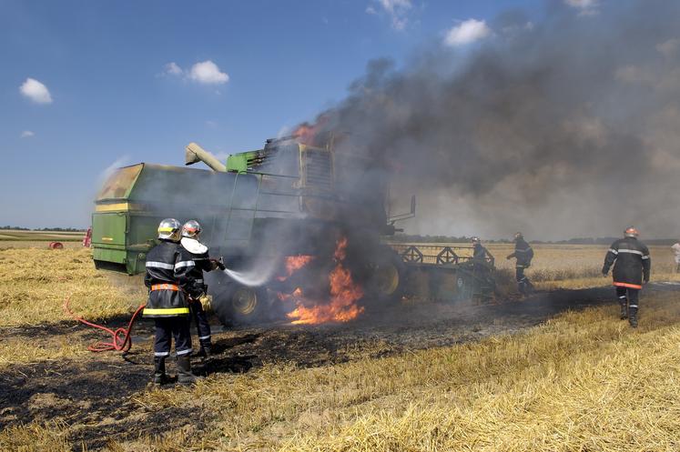 Pendant la moisson, la vigilance sera particulière aux heures les plus chaudes de la journée et dans les parcelles situées en bordure de route, de voies ferrées, d’habitations, de bois et de lieux sensibles à un départ de feu. «Penser à nettoyer la machine régulièrement. L’utilisation d’un compresseur de chantier est un moyen efficace», préconise Groupama. Autres conseils : dans les parcelles de superficie élevée, réalisez dès le début du chantier des bandes coupe-feu de quatre à cinq largeurs de machines. «Lors d’un départ de feu, un tracteur attelé à un outil de déchaumage laissé à proximité du chantier pourra aider à contenir cette zone en la détourant rapidement, en se positionnant à environ 200 m pour avoir le temps de réaliser une bande de terrain coupe-feu assez large.» Un réglage plus haut de la coupe de la machine évitera certaines interactions avec le sol conduisant à des frictions. Bien veiller également à remonter les palpeurs de la moissonneuse si celle-ci en dispose. Dans l’idéal, prévoir une tonne à eau sur place avec un raccord compatible avec les équipements des services de secours (DSP 65 ou DSP 100).