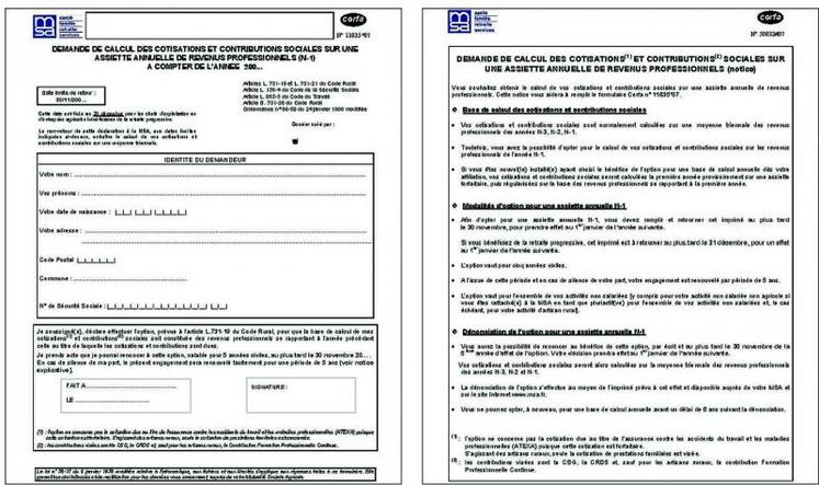 Les agriculteurs en moyenne triennale peuvent opter pour une assiette annuelle à partir du 1er janvier 2013, (sur leurs revenus 2012). Dans ce cas, vous devez adresser à la MSA votre option sur un imprimé prévu à cet effet avant le 30 novembre 2012. Cette option est faite pour une durée de cinq ans, renouvelable tacitement, s’il n’y a pas renonciation à l’option.