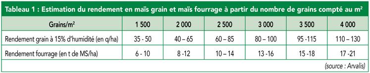 La première étape consiste à estimer le rendement de la parcelle en maïs grain. Pour estimer ce-lui-ci et d’autant plus cette année, à la vue des fortes hétérogénéités entre les parcelles observées en plaine, il est important de se rendre dans les parcelles afin d’évaluer le potentiel rendement en grains des parcelles. Car attention, «le développement de la plante n’est pas représentatif du potentiel de rendement, en effet, un maïs peut être bien développé mais avec des pains de maïs remplis à deux tiers», rappelle Claire Leroy. Ainsi, pour estimer au mieux le rendement de la parcelle, la Chambre préconise de se référer au protocole défini par Arvalis (cf Estimation du nombre de grains au m2 et Tableau 1 ci-dessous).