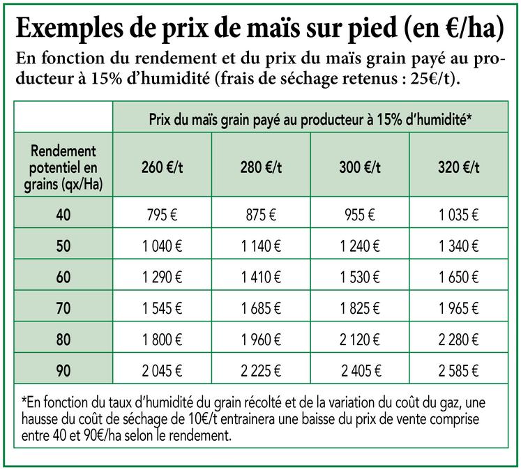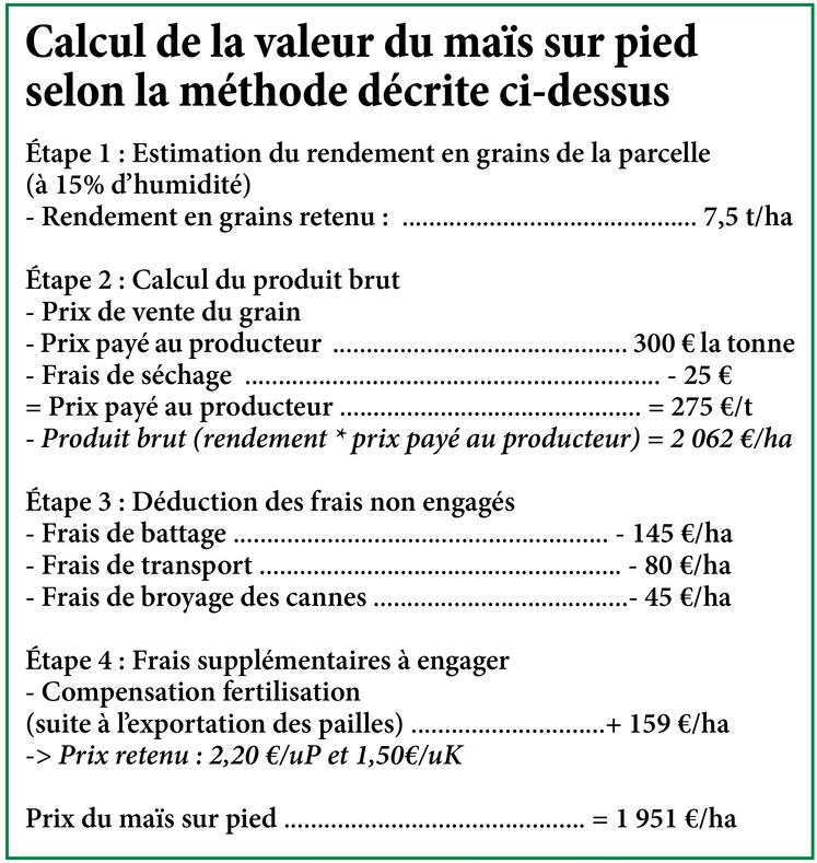 La méthode de calcul retenue cette année repose sur le principe d’équivalence entre le produit de la vente du maïs sur pied et le produit qu’aurait obtenu le vendeur s’il avait récolté son maïs en grain. Celle-ci se décline en