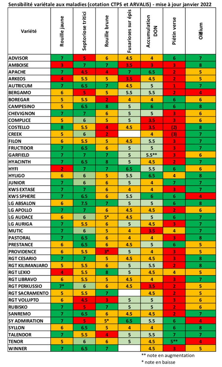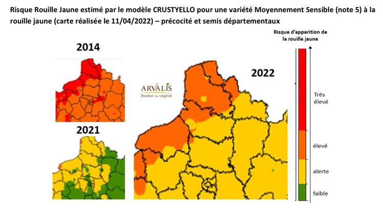 Le premier critère qui détermine le risque rouille jaune reste la sensibilité variétale (cf. tableau), mais le climat rencontré explique également le risque. Le modèle «CrustYello» indique au 11 avril un risque maintenant assez élevé sur la région Hauts-de-France, particulièrement pour les situations à risque : variétés sensibles (Complice, Amboise, Campesino, RGT Sacramento...) en secteur maritime. L’année 2022 s’annonce un peu plus à risque que l’année dernière, mais tout de même moins que la référence haute 2014. La vigilance reste de mise et l’observation en parcelle nécessaire. Rappelons également qu’une grande majorité de variétés cultivées dans la région restent peu sensibles à cette maladie (Chevignon, KWS Extase, Rubisko...).
