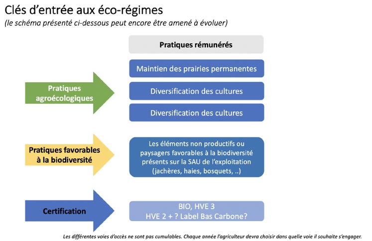 Mais l’une des plus grandes évolutions notables dans les aides accordées au travers du 1er pilier de la Pac sera la disparation du paiement vert qui se voit «remplacé» par les éco-régimes. Ces nouvelles aides rémunéreront les pratiques favorables à l’environnement, allant au-delà de la conditionnalité. 25 % du budget du premier pilier sera consacré à ces aides. La demande de celles-ci se fera sur la base du volontariat. Aujourd’hui, d’après les premiers éléments communiqués par le ministère l’accès à ces éco-régimes se fera via trois voies (non cumulables entre-elles) et sur deux niveaux de paiement (base et supérieur). L’une des voies d’accès à ces éco-régimes serait la mise en œuvre de pratiques de gestion agro-écologique sur l’exploitation. Ainsi, il pourrait être rémunéré via la mise en place d’un système à points la diversification des cultures (l’idée étant d’inciter les agriculteurs à diversifier leur assolement sur l’année, en privilégiant les protéagineux et les prairies temporaires), le maintien des prairies permanentes ou encore la mise en place de couvertures végétales de l’inter-rang (CP). Une autre voie d’accès aux éco-régimes pourrait être le respecter un pourcentage d’éléments favorables à la biodiversité «non productifs» à l’échelle de l’exploitation et ce quel que soit le type de couvert végétal de l’exploitant (terres arables, prairies permanentes, cultures pérennes). Enfin, la dernière voie d’accès serait la certification (Bio, HVE 3). Ainsi, les exploitations certifiées sur la totalité de leur surface pourraient prétendre à accéder à l’éco-régime par cette voie de certification.