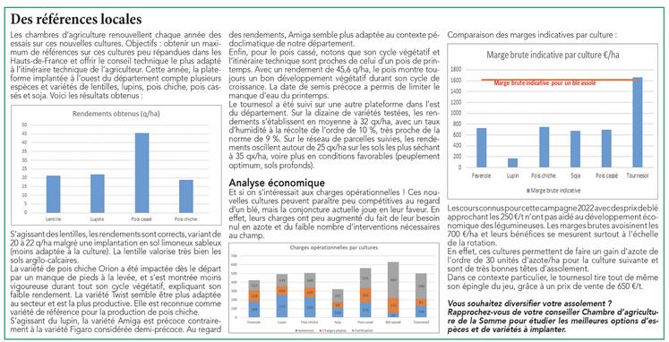 Fournir des références techniques et des valeurs économiques est essentiel pour avancer dans la modification de son assolement. La Chambre d’agriculture de la Somme travaille sur ces nouvelles cultures depuis plusieurs années au travers d’expérimentations et accompagne les agriculteurs ayant déjà sauté le pas de diversifier leur assolement.
