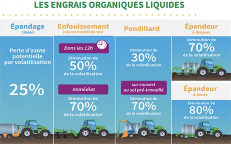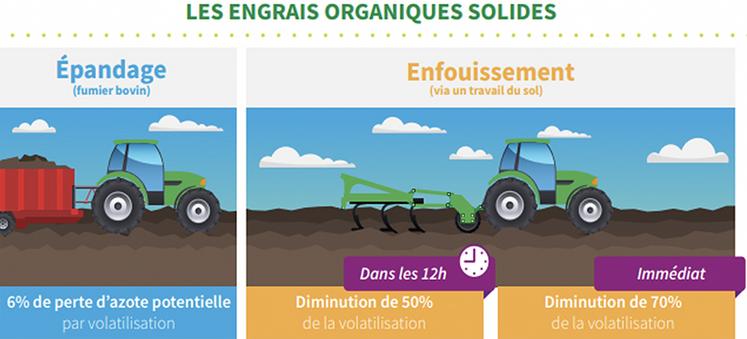 Le fait d’enfouir, d’épandre avant une pluie ou de localiser les engrais minéraux va permettre de diminuer la perte par volatilisation de 65 à 85%. Au niveau des engrais organiques, nous distinguons la forme liquide de la forme solide. En effet, les lisiers pourront avoir des pertes par volatilisation de l’ordre de 25% contre 6% pour les fumiers et composts.