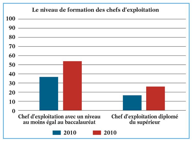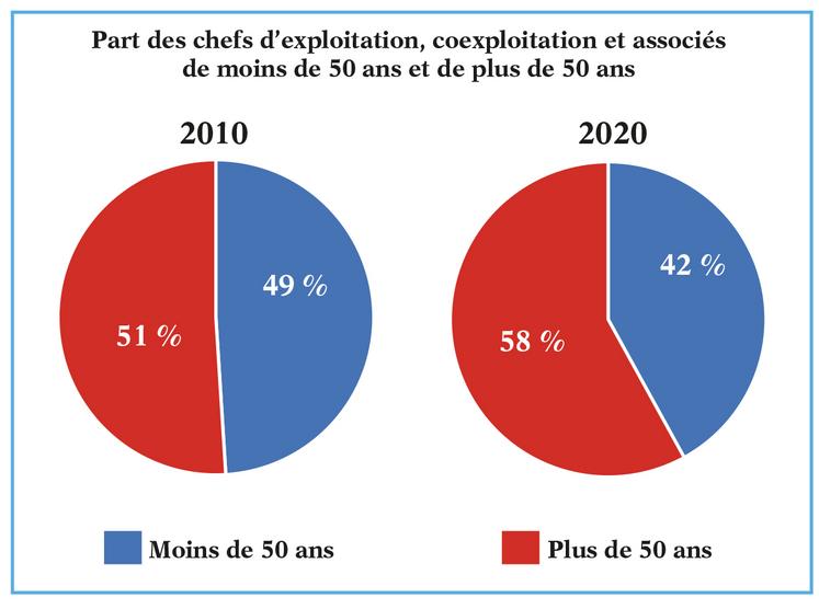 En parallèle, l’emploi a également continué de baisser, de 12 % (en équivalent temps plein) soit un peu moins vite que le nombre d’exploitations agricoles, signe d’une augmentation du nombre d’actifs par ferme. 759 000 personnes occupent un emploi permanent dans les exploitations agricoles (583 000 ETP). En parallèle, la part des salariés continue de progresser, pour atteindre 139 000 ETP. Le nombre de saisonniers est, quant à lui, en légère baisse, à 76 000 ETP. La part des femmes cheffes, coexploitants ou associés actives est encore en recul (- 0,5 %), sous l’effet de l’érosion du modèle d’exploitation familiale gérée en couple. Le niveau de diplôme des chefs d’exploitation et coexploitants a continué de grimper : 55 % d’entre eux ont un diplôme au moins égal au baccalauréat, contre 38 % en 2010. Les chefs d’exploitation continuent de vieillir. Un quart d’entre eux ont plus de 60 ans, contre 20 % en 2010. C’est la tranche de population dont l’effectif croît le plus, celle des moins de 39 ans restant stable.
