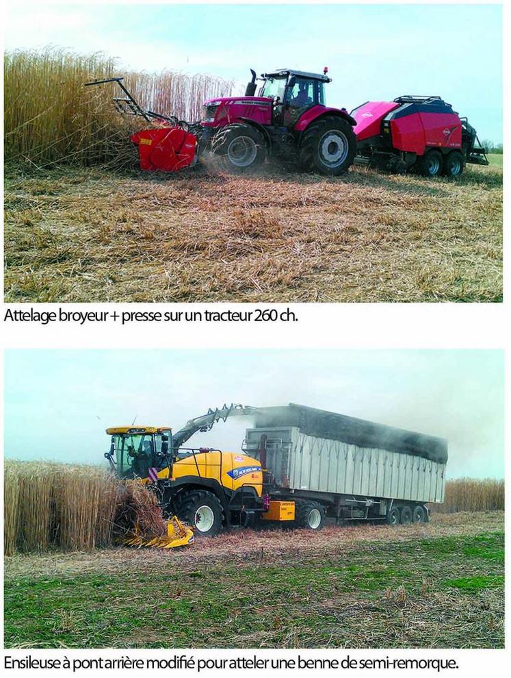 Le miscanthus se récolte sec au cours du mois d’avril et présente un rendement d’environ 15 tonnes de MS/ha en conditions pédoclimatiques favorables (profondeur du sol, alimentation en eau…). Il est traditionnellement récolté à l’aide d’ensileuses à maïs non modifiées équipées d’un bec rotatif. Pour augmenter les débits de chantier, Philippe Colin a fait modifier le pont arrière de l’ensileuse par un constructeur du Jura (Ets Racine) de manière à y atteler une benne de semi remorque. Avant cette modification, le chantier nécessitait trois bennes agricoles de 40 m3 avec trois chauffeurs et donc trois tracteurs. Le débit était de 2 à 2,5 ha/h. Aujourd’hui, le débit passe à 3 ha/h mais en utilisant seulement deux remorques de semi et un tracteur routier avec chauffeur.