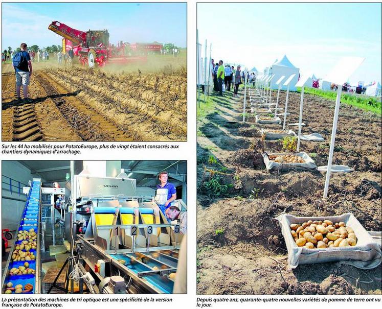 L’édition 2016 de PotatoEurope a fait carton plein : près de 12 000 visiteurs ont été accueillis sur le site d’Arvalis-Institut du végétal à Villers-Saint-Christophe, dans l’Aisne. 40 % de visiteurs étrangers ont fait le déplacement, en provenance pour la plupart du Benelux, d’Allemagne et du Royaume-Uni, mais aussi de plus de 70 pays différents. PotatoEurope est devenu un rendez-vous commercial international : que ce soit le secteur du plant, celui du commerce de la pomme de terre de consommation (la France est le premier exportateur européen) ou encore des industries de la transformation, tous ont attiré un large public international. Lors de l’inauguration de l’événement, Didier Lombart, président d’Arvalis-Institut du végétal, a fait part de «sa fierté de partager le travail d’une filière dynamique et innovante». Il a notamment fait référence au projet Defipom 2020 dont l’objectif est de préparer l’avenir de la filière. «Nous voulons des exploitations performantes, compétitives et capables de répondre aux exigences de la société», a-t-il affirmé.