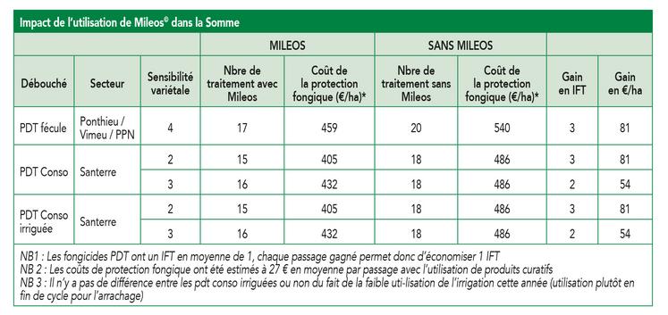 La Chambre d’agriculture de la Somme propose un suivi des parcelles de pommes de terre basé sur l’outil d’aide à la décision Mileos© développé par Arvalis. Il gère la protection fongicide en fonction de la pression maladie et permet de déclencher un traitement que lorsque nécessaire, c’est-à-dire quand les seuils sont atteints. Le cas échéant, les indications données par Mileos© permettent aussi de choisir le fongicide le plus adapté à la contamination de la parcelle. Mileos© a pour objectif de couvrir 90 % des surfaces de pommes de terre dans les années qui arrivent du fait de sa simplicité d’utilisation, de son coût et de sa fiabilité. La Chambre d’agriculture de la Somme accompagne déjà 80 exploitations de la Somme avec Mileos©.