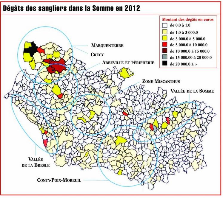 Il a cité quelques exemples marquants. «Pour le maïs grain, on est passé de 20 ha détruit en 2011 à 57 ha en 2012, soit une augmentation de 185%. Pour le maïs fourrage on est passé de 33 ha à 70 ha, soit une augmentation de 112 %. Pour l'année 2012, ces dégâts représentent une surface de 309 ha et un montant de 395 080 euros».