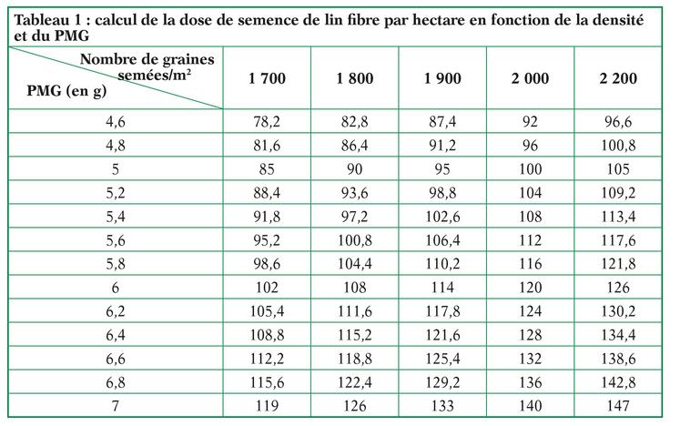 Le lin compense mal une hétérogénéité, la régularité du peuplement prime alors sur la densité. Le liniculteur doit viser un peuplement de 1 500 à 1 600 plantes viables par mètre carré. Une densité trop importante génère des lins petits et sensibles aux bioagresseurs. Le tableau ci-dessous reprend les valeurs indicatives des doses de semences en fonction du poids de mille graines (PMG). Ces valeurs sont à ajuster selon la date de semis et le type de sol. Pour les semis en sols difficiles (forte teneur en argile, préparation grossière), il est conseillé d’augmenter la dose de semences de l’ordre de 20 % afin de pallier d’éventuels problèmes de levée. Pour les semis précoces, souvent réalisés dans des sols froids, mal ressuyés et avec des préparations de sol grossières, il convient de majorer la densité de semis d’environ 10 %. Pour les semis plus tardifs, favorables à une bonne germination des plantes, il n’est généralement pas nécessaire d’augmenter la dose de semences.