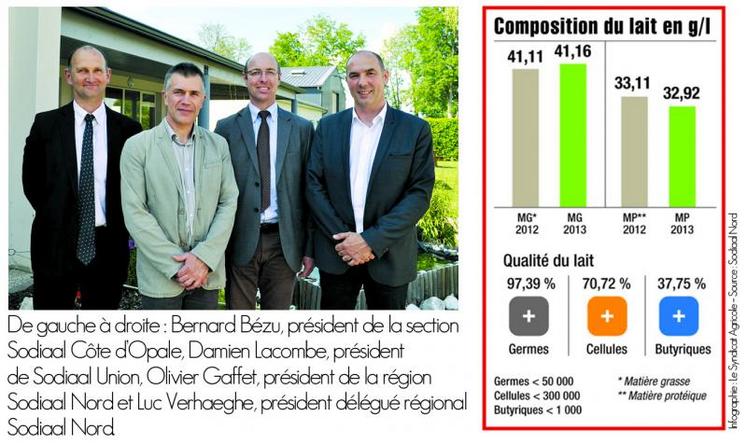 Les principales évolutions pour cette campagne laitière 2013-2014 ont été la mise en place d’un prix de contrôle suite à la suppression de la TFA sur les dépassements de quota, ainsi que le déploiement de plusieurs mesures incitatives visant à améliorer la saisonnalité tels que le décalage de la période sans volume B sur les mois d’août, septembre et octobre ; avec la possibilité sur cette période de produire au-delà de 8,33 % du quota sans que ces volumes supplémentaires ne soient pris en compte pour le déclenchement du prix de contrôle en fin de campagne. «Au total, cela correspond à 46 millions de prêt de quota supplémentaire pour 5 832 producteurs, soit en moyenne 7 900 litres en plus par producteur, précise Jean-Charles Mallard, directeur de Sodiaal Nord. À noter que 44 % des producteurs de la région ont pu en bénéficier, avec une moyenne de 9 150 litres en plus par producteur».