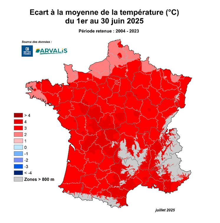 Contrairement à l’année 2024, les semis ont pu démarrer dès la 2e décade d’avril dans de nombreuses régions de la moitié nord de la France (Grand Est, Bourgogne, Hauts-de-France, Normandie, Île-de-France, Centre, Pays de la Loire) à l’exception de la Bretagne où les semis ont été réalisés à partir de la fin avril. Les conditions plus humides au sud de la Loire ont eu pour conséquence des semis plus tardifs qu’à l’accoutumée sur ces régions. Sur les mois de mai et surtout juin, comme l’illustre la carte ci-contre, l’écart à la moyenne de la température en °C du 1er au 30 juin est excédentaire par rapport à la normale (période 2004-2023). Cela entraîne une croissance rapide des maïs et une floraison précoce.