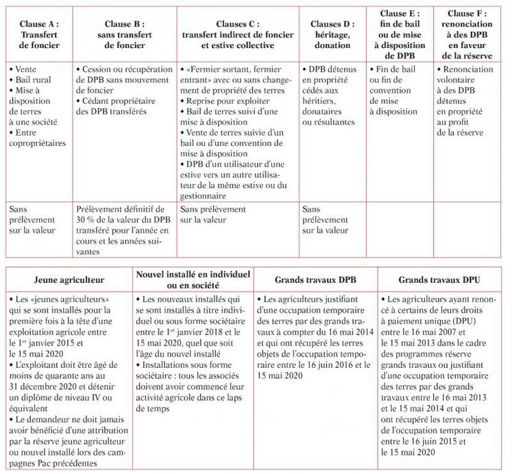 De la même manière qu’en 2019 et adaptées aux différents cas de transferts, on retrouve les clauses A, B, C, D, E et F. Sur chaque clause de transfert, le détenteur et le repreneur des DPB devront préciser le nombre de DPB transférés, la valeur unitaire 2019 (figurant sur la notice du portefeuille du cédant dans l’onglet «Données et documents» sur le site Telepac), la localisation des parcelles et les numéros d’îlots de la déclaration Pac 2020 du bénéficiaire.