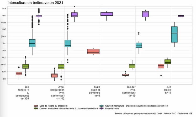 La récolte du précédent a lieu généralement à la fin juillet (date moyenne le 24 juillet dans les enquêtes 2021), et l’implantation de la betterave fin mars (28 mars en 2021), ce qui laisse un intervalle conséquent pendant lequel un couvert d’interculture est implanté, pour une durée de l’ordre de 110 jours, limitant ainsi la durée de sol nu des parcelles. La date de récolte du précédent joue sur les dates d’implantation et donc de destruction du couvert d’interculture. À noter, dans quelques parcelles après précédents céréales à pailles, les couverts peuvent être maintenus tout l’hiver, et détruits peu de temps avant semis des betteraves, choix certainement assumé et justifié, mais assez délicat à conduire.