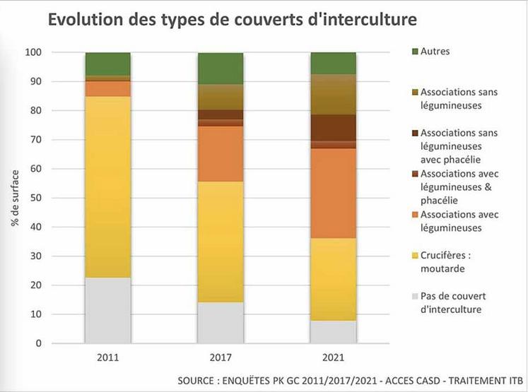 On constate, depuis 2017, une augmentation des surfaces implantées avec un couvert d’interculture qui atteignent désormais 92 %, en grande majorité non récolté (88,5 %), et pour 4 % des surfaces une culture dérobée, également en augmentation (1,5 % des surfaces en 2017). On peut interpréter ces dernières comme sans doute des exportations pour alimenter des méthaniseurs. Le type de couvert d’interculture a également évolué ces dernières années, avec une diversification des types de couverts implantés : la moutarde est en retrait au profit de mélanges qui sont ainsi passés de 7 % en 2011 à 33 % en 2017 et 56 % en 2021.