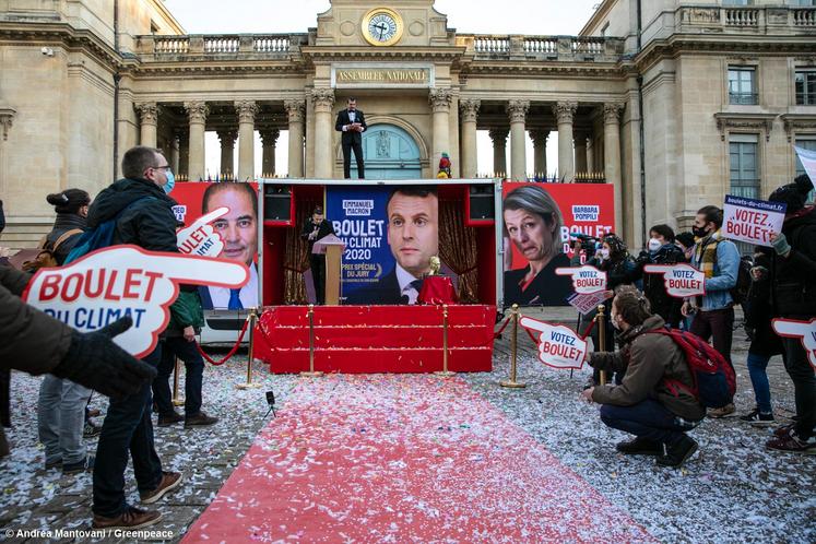 Mardi 26 janvier, c’est devant l’Assemblée nationale avec tapis rouge, scène, banderoles et quelques militants chargés de représenter un public pas si nombreux que celui revendiqué que l’association Greenpeace organisait la remise des Boulets du climat à des personnalités politiques – députés ou ministres – pour « leur inaction en faveur du climat ».