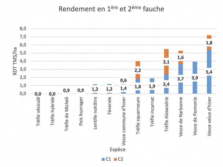 Une première fauche (C1) a eu lieu le 29 avril 2022 et une deuxième (C2) le 10 juin 2022 (C1 + 6 semaines). Comme nous pouvons le constater sur le graphique ci-contre nous avons eu un bon comportement des vesces à l’exception de la vesce commune d’hiver qui a subi des dégâts de gel. Cette dernière affiche un bon comportement sur les autres plateformes. Au niveau des trèfles, le trèfle vésicule et hybride n’ont pas pu être récoltés en raison d’un faible développement par rap-port aux autres.