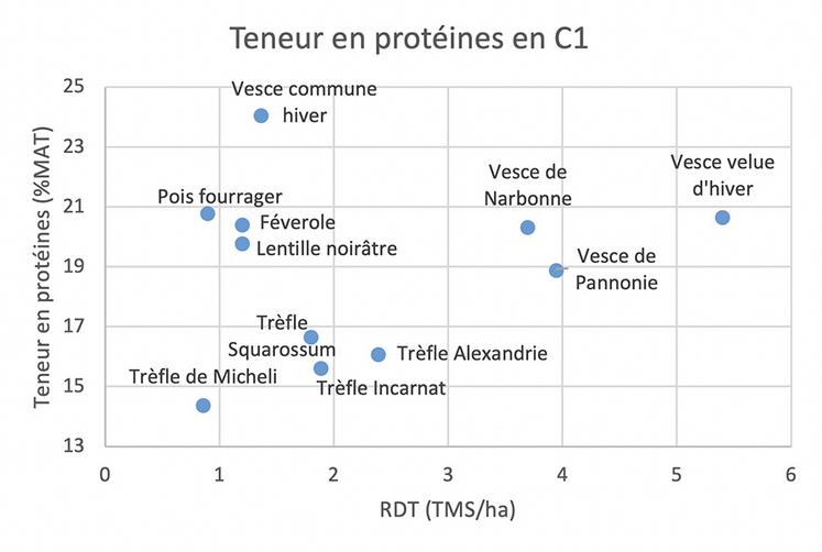 Sur la première coupe, la teneur en protéines des vesces de Narbonne, de Pannonie et velue d’hiver est très satisfaisante d’autant plus que ces espèces possèdent un bon rendement. En revanche, la valeur alimentaire des trèfles est un peu décevante.