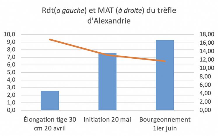 Plus nous avançons dans le stade, moins bonne est la valeur protéique. Cependant, la baisse est plus faible qu’un ray grass ou un seigle. Le trèfle d’Alexandrie s’est bien comporté dans l’essai en raison de l’hiver doux. Dans le cas d’un méteil d’hiver que l’on souhaite récolter tôt (fin avril), ces trois trèfles assurent un rendement et une valeur alimentaire correcte à fin avril.