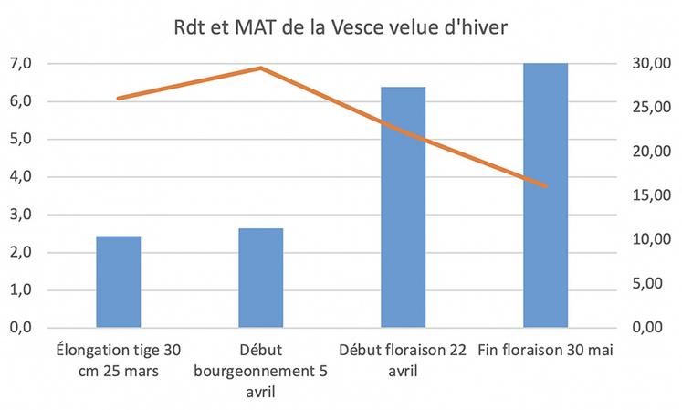 Les vesces disposent d’excellentes valeurs alimentaires. Dans l’essai, la vesce velue d’hiver se démarque pour son rendement précoce et sa valeur en protéines qui atteint presque les 30 % début avril.