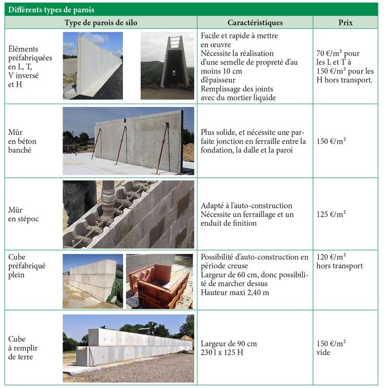 Après un décapage de la terre végétale, il faut prévoir un remblai compacté d’au moins 30 cm, une armature treillis ST 10 20 x 20 et un dallage béton de minimum 15 cm de type XA03 (agressivité sévère par l’acidité). Y installer des joints de dilatation tous les 5 à 6 m de large ou par sciage sur le tiers de la profondeur. Un surfaçage à la règle vibrante et une finition à la truelle mécanique. Enfin, une humidification ou produit de cure est recommandé pour éviter les fissurations. Suivant les opportunités, l’enrobé peut être utilisé, à condition d’y associer un traitement anti-acide type «Rurcol». Dans tous les cas, une pente vers l’avant ou transversale de 1 % minimum est primordiale pour évacuer les eaux de ruissellement. Enfin, pour les parois, différents procédés existent sur le marché (cf. encadré ci-dessous). Gardons en tête, que la qualité des unités de stockage utilisées n’est pas le seul garant d’avoir un produit optimum lors de la reprise de l’aliment. La mise en silo, le tassage et la couverture rapide et homogène jouent un rôle essentiel dans la conservation du produit au final. Des aides dans le cadre des pré’ad de la région Hauts-de-France existent sous certaines conditions d’accès, n’hésitez pas à vous rapprocher des conseillers bâtiments.