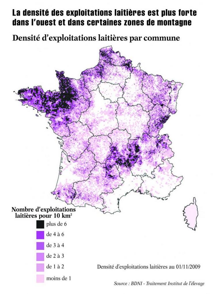 La production laitière s’est extrêmement concentrée en France entre 2000 et 2010, selon une note Agreste primeur publiée le 3 janvier 2014. Plus d’un tiers des exploitations ont disparu (37 %), la surface de celles restantes s’est accrue de 36 % (en moyenne : 95 hectares), la taille des troupeaux a augmenté de 40 % (en moyenne : 49 vaches), et le quota moyen de deux tiers (en moyenne : 453 000 litres). Les arrêts sont causés par des départs à la retraite mais aussi par la réorientation des exploitations vers la culture de céréales, surtout dans les zones à faible densité laitière.