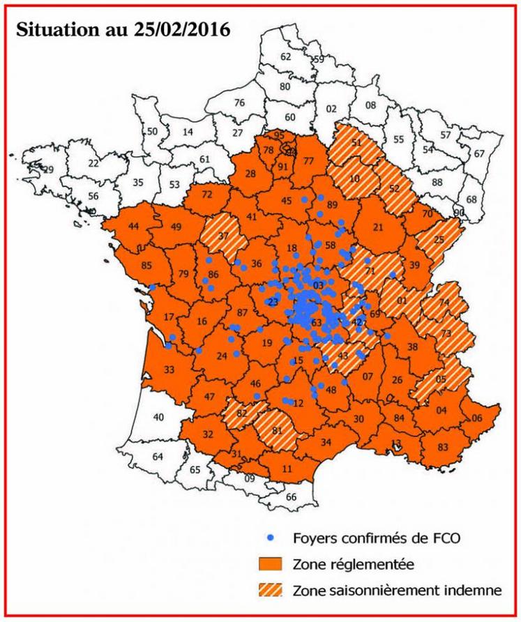 Le fait marquant de ces derniers mois a été sans aucun doute la résurgence du virus de la fièvre catarrhale en août 2015, isolé sur un bélier suspect dans l’Allier. Les différentes enquêtes effectuées depuis confortent l’hypothèse d’un réveil focalisé sur le Massif Central, dont la cause probable serait un défaut de vaccination sur ce secteur. L’Etat a géré la crise avec l’objectif de rétablir au plus vite les flux commerciaux et s’en est plutôt bien sorti, au prix d’analyses coûteuses et de vaccins pratiqués en urgence. Et maintenant, que va-t-il se passer ? En cette fin d’hiver, le pays est toujours séparé en deux zones, réglementées et indemnes, dont les départements du nord font encore partie.