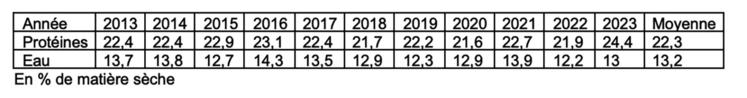 Après une chute en 2022 à 68 000 ha, la surface en féverole remonte à 80 000 ha, retrouvant ses niveaux précédents. Mais le rendement national reste faible, à 27,5 q/ha. Le printemps chaud et sec n’a pas permis à la culture d’exprimer son potentiel, excepté dans le nord de la France où les pluies de l’été ont permis un remplissage correct des grains. La production nationale remonte ainsi à 222 000 tonnes contre 158 000 en 2022. Côté qualité, la teneur en protéines est dans la moyenne des dix dernières années, à 28,2 % de matière sèche et la qualité visuelle est correcte. Ce taux de protéines est homogène dans les régions globalement. La teneur en eau, à 13,3 % en moyenne, est correcte. Les échantillons sont assez propres, sans graines germées.