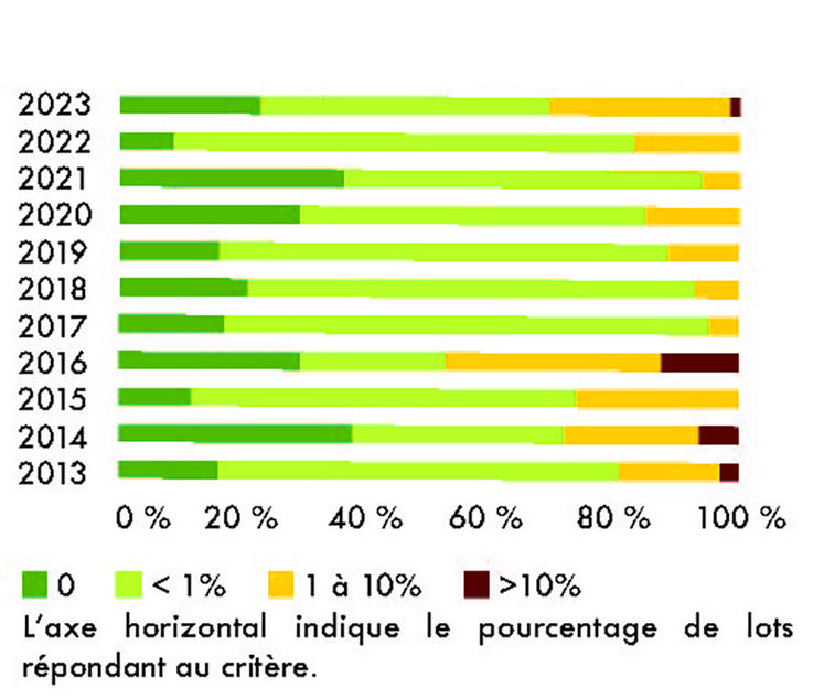 Les graines avec des piqûres d’insectes sont en hausse, avec 70 % des lots qui en contiennent moins de 1 %. Un peu plus de 45 % présentent des dégâts de bruche et un peu plus de 30 % des dégâts de tordeuse. Pour finir, aucune mycotoxine de champ n’a été repérée, ce qui témoigne d’une bonne qualité sanitaire des lots.