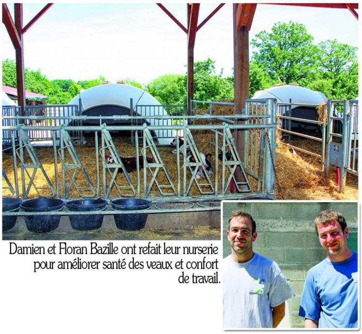 «Lorsqu’en 2011, j’ai rejoint mon frère Floran, installé sur l’exploitation familiale en 2005, nous avions pas mal de problèmes pulmonaires sur les veaux. Or, à mon arrivée nous avons repris un troupeau et fortement augmenter la taille du cheptel. La nurserie se situait dans un ancien bâtiment. Nous l’avons alors totalement repensée. Après quelques visites, nous avons opté pour un logement avec igloos collectifs semi-ouverts et aire d’exercice paillée couverte. Après la naissance, les veaux restent trois semaines dans des niches individuelles, avant de passer dans l’un des cinq igloos de 11 places aux cornadis, pour y rester quatre mois environ», explique Damien Bazille, du Gaec de la Retellière à Saint Mars d’Egrenne dans l’Orne.