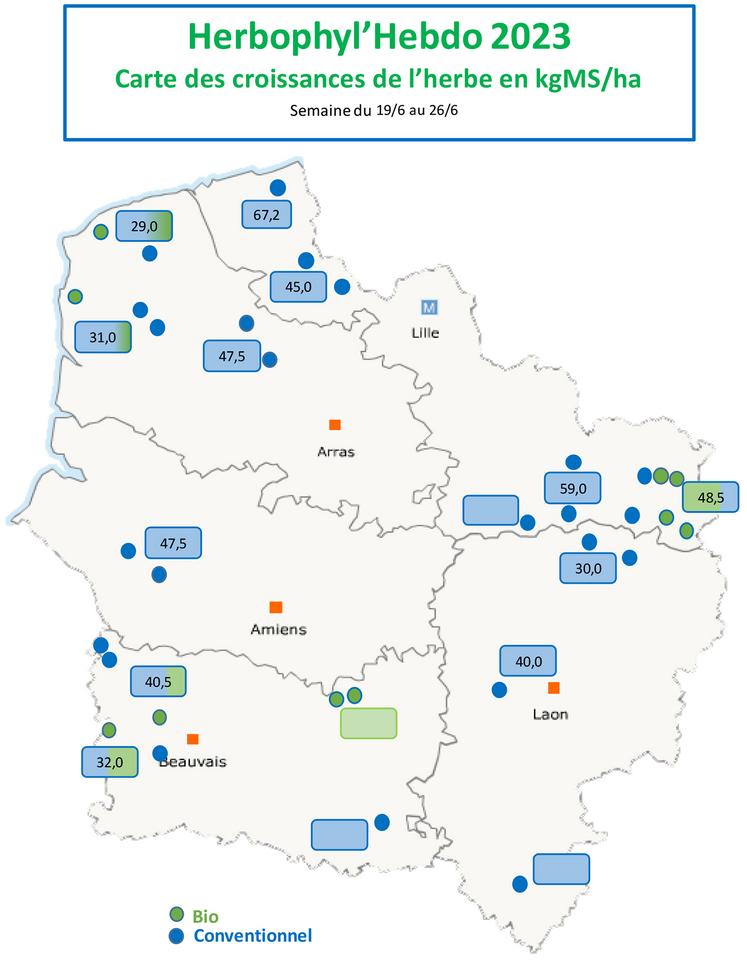La pousse moyenne de la semaine s’élève à 43,1 kg de MS/ha/j. La pluviométrie hétérogène, mais généralisée autour de 40 mm, a permis de stabiliser cette pousse.